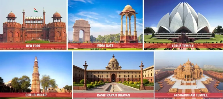Popular spots include India Gate, Qutub Minar, Lotus Temple, Red Fort, Humayun’s Tomb, and Akshardham.